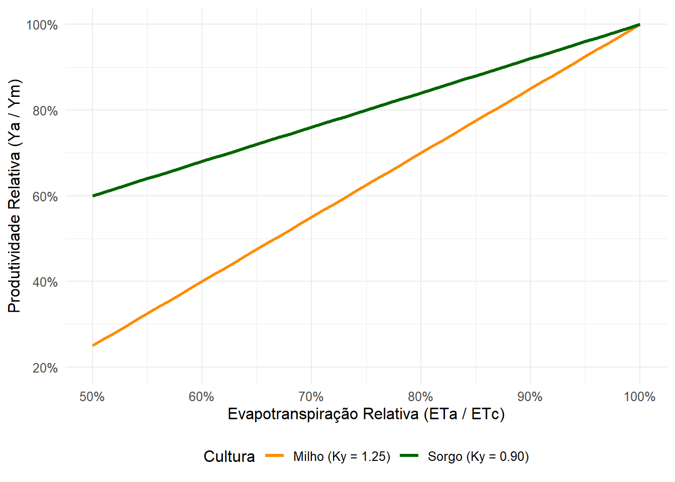 Figura 1.14: Impacto do déficit hídrico na produtividade relativa modelo empírico de Doorenbos & Kassam (FAO). O gráfico compara o comportamento de duas espécies com diferentes graus de sensibilidade ao estresse hídrico: milho (Ky = 1,25 - altamente sensível), e sorgo (Ky = 0,80 - mais tolerante). Fonte: o autor.