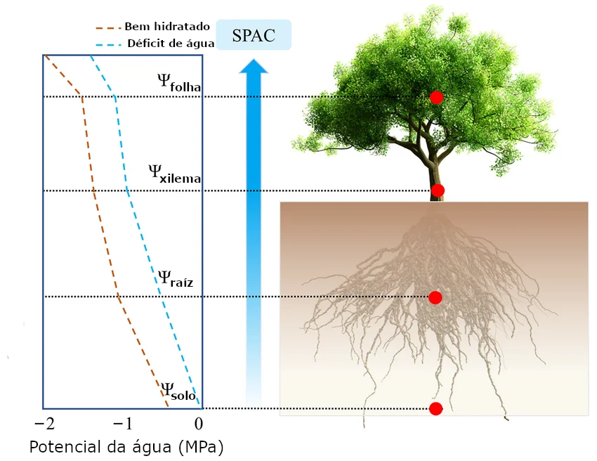 O movimento da água no sistema solo-planta-atmosfera (SPA) é um processo passivo, impulsionado pela diferença de potencial hídrico entre o solo, a planta e a atmosfera. A água flui de regiões com maior potencial hídrico (maior energia potencial) para regiões com menor potencial hídrico (menor energia potencial).