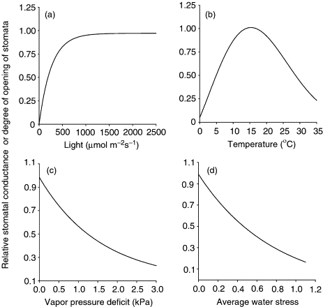 Figura 1.13: Dinâmica da resposta estomática frente a diferentes variáveis ambientais. A condutância estomática relativa é modulada por quatro fatores principais: (a) Abertura rápida em resposta ao incremento da radiação luminosa; (b) Efeito da temperatura, demonstrando um aumento de abertura até um ponto ótimo, seguido de fechamento sob calor excessivo; (c) Fechamento progressivo impulsionado pelo aumento do déficit de pressão de vapor (DPV) da atmosfera, fator físico que frequentemente justifica o fechamento observado em altas temperaturas; e (d) Redução da condutância em função do estresse hídrico médio acumulado pela folha. Cabe ressaltar que a sensibilidade e o formato exato dessas curvas variam significativamente entre diferentes espécies vegetais. Fonte: BEADLE, C.; SANDS, R. TREE PHYSIOLOGY| Physiology and Silviculture. 2004. In. BURLEY, Jeffery. Encyclopedia of forest sciences. Academic Press, 2004.