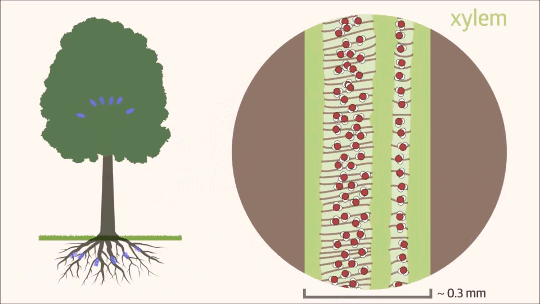 Figura 1.8: Representação animada do fluxo ascendente da água no xilema. O esquema à esquerda ilustra a conexão entre o sistema radicular e a transpiração nas folhas. Fonte: https://fyfluiddynamics.com/2018/04/trees-are-incredible-organisms-and-the-physics/