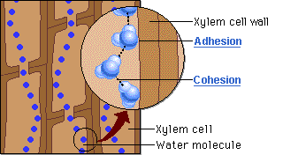 Ainda assim, como o peso dessa coluna de água é considerável, a coesão por si só não seria suficiente para evitar o seu colapso sob o efeito da gravidade. Nesse ponto atua a adesão, que é a notável afinidade das moléculas de água pelas paredes hidrofílicas internas do xilema, ricas em celulose e lignina. Essa aderência funciona como um suporte físico indispensável ao longo de todo o trajeto, ajudando a sustentar o peso da coluna líquida contra a força gravitacional.
