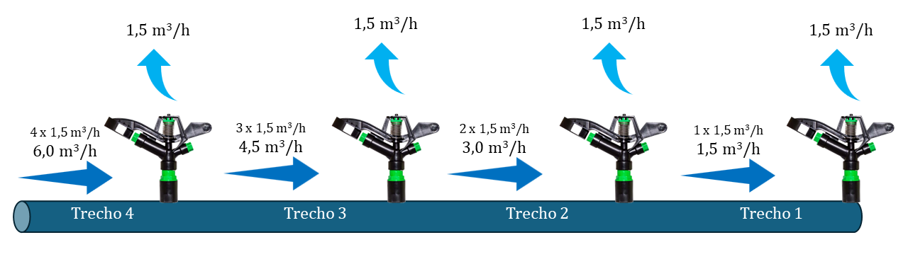 Veja o exemplo da Figura 8.1. Para uma vazão de cada emissor de Qem = 1,5 m3/h, a vazão em cada trecho fica: